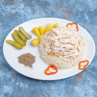 500 Gr Pirinç Pilavı, 500 Gr. Tavuk, Kornişon Turşu, Acı Biber Turşusu, Karabiber, Zeytinyağlı Haydari