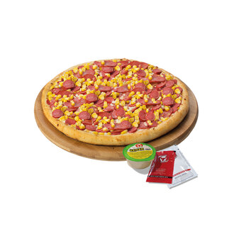 Özel pizza sosu, mozzarella peyniri, sucuk, sosis, mısır