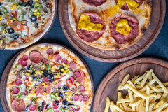 Pizza sosu, mozzarella peyniri, sucuk, sosis, yeşilbiber, mısır