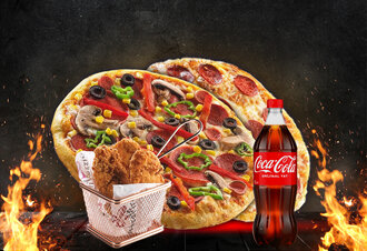 2 Adet Seçeceğiniz Orta Boy Pizza + Seçeceğiniz Yan Ürün + İçecek (1 L.)