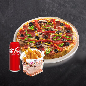 Seçeceğiniz 3 Adet Orta Boy Pizza + 1 lt İçecek +Patates Kızartması + Soğan Halkası (8 Adet) + Patates Kroket (8 Adet) + Nugget (4 Adet)