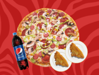 Büyük Boy Karışık Pizza + Elma Dilim Patates + 10 Adet Baharatlı Tavuk Topları + İçecek (1 L.)