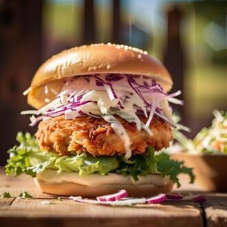 Ürün İçeriğinde : 130 Gr çıtır kajun tavuk, coleslaw purple sos, burger sos, patates kızartması ile Servis Edilir.