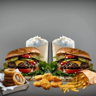 Menü içeriğinde: 1 adet chesse burger + patates kızartması, 1 adet red burger + patates kızartması, 2 adet çamlıca gazoz ile Servis Edilir.