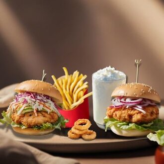 Menü içeriğinde: 1 adet red burger + patates kızartması, 1 adet purple burger + patates kızartması, 1 adet crispy joy burger + patates kızartması, 1 litre çamlıca gazoz, 3 adet 70'er gr tenders tavuk ile servis edilir.