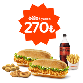 2 Adet Popchicken Sandviç + Patates Kızartması (Orta) + Nuggets (4'lü) + Soğan Halkası (4'lü) + 1L. İçecek (Popchicken seçimleri için geçerlidir.
