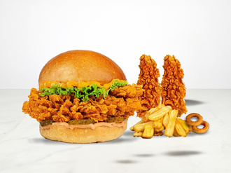 Red Hot Soslu Çıtır Tavuk Burger + 2 Adet Çıtır Tavuk Parçası + 2 Adet Soğan Halkası + Patates Kızartması + 2 Adet Sos
