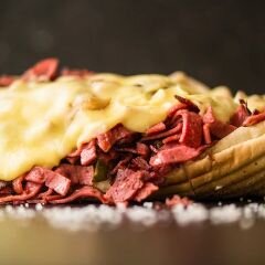 Acuka, Köz Biber, Kaşar Peyniri, Cheddar Peyniri, Mantar, Patates Kızartması, Gurme Sos