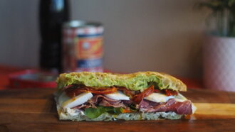 80 gr. mortadella, biberiyeli zeytin ezmesi, mimolette, sarımsak, confit, domates, roka, zeytinyağı