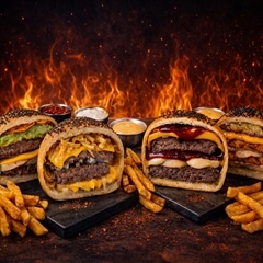 150 gr. dana köfte, cheddar sos, karamelize soğan, mantar sos, közlenmiş patlıcan, közlenmiş biber. Patates kızartması ile